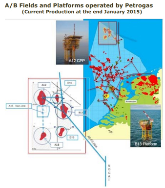 PEPN owns and operates interests in the A and B Blocks (including the recently acquired A15 and B17 licences). In 2005, the company and its partners were granted production licenses enabling the development of the A/B shallow gas fields in the Dutch North Sea. A central processing platform and an export pipeline were installed in Block A12 in 2007. First gas was achieved in December 2007. Since then the B13 (unmanned) production platformhas been commissioned and brought online in December 2011.